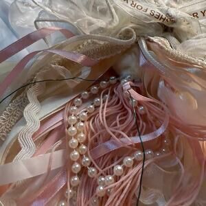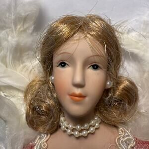 VTG Porcelain Angel Christmas Ornament Cream Pink Pearl Lace Feathers Ribbon 12”