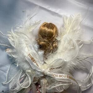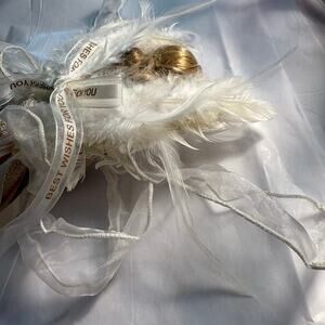 Note: I added a few new feathers to her wings as her original were looking a bit tattered. Also, there was a glob of glue on one of the ribbons on the front of her dress I scraped off. The satin shows a bit of distressing in that area. Please see photos to review her condition to see that she meets your standards. Thanks.