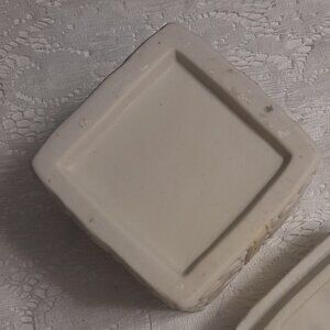 3" tall, gold trim and creamy white. No chips or cracks. Heart decor with top bow.