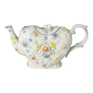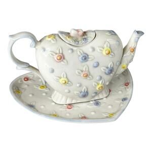 • Great Children's Or Doll Teapot, Lid and Plate In Heart Shape With Pastel Raised Chintz Flower Designs