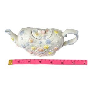 Vintage Porcelain Heart TEAPOT & PLATE Tea Set 6.5" Ceramic Flowers White Blue Pink - Excellent Condition!