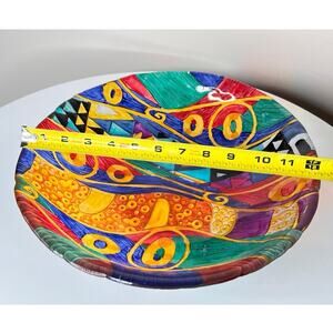 Gorgeous decorative art glass bowl inspired by the colorful, abstract patterns of Austrian painter Gustav Klimt. The inner bowl surface is smooth while the exterior has a dimensional relief pattern with applied color. Measures 12” in diameter and 3” tall.