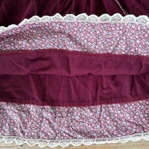 Vintage Gunne Sax Style Prairie Skirt. Tagged girl’s size 6X. Vintage paper tag made in USA. Pert ‘n Perky brand. Deep Maroon corduroy with calico ditzy floral and lace accents. Subtle V seam at front yolk with lace-up accent. Elastic at back of waist. Adorable!! Great vintage condition with light wash wear. The elastic is still stretchy with good rebound. No holes or staining.