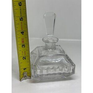 Elegant vintage pressed glass bottle with a square Art Deco design and crystal-style clarity. A beautiful vanity or décor piece — empty bottle with a small chip on the stopper, adding authentic vintage charm.