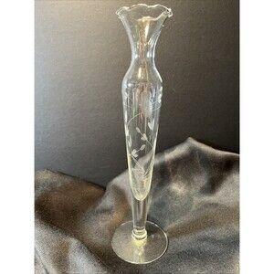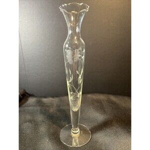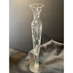 The VTG Princess House Heritage Hand Blown Crystal Bud Vase #409 is a stunning piece with ruffled edges, measuring 10 inches in height. This small vase features a floral pattern and clear crystal material, hand-blown in 1985. The vintage vase exudes a delicate and elegant style, perfect for all occasions. With its original production technique and handmade craftsmanship, this vase is a beautiful addition to any collection of decorative collectibles from the late 20th century. Its intricate design and etched finish make it a timeless piece that captures the essence of the 1980s era.