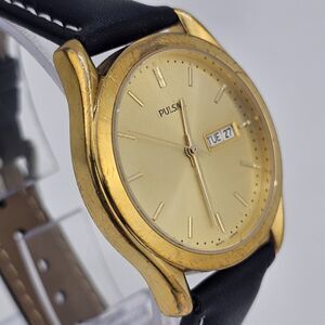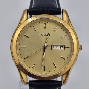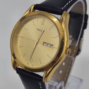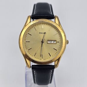 VTG Pulsar Men's Watch 37MM Gold Dial Day Date New Black Leather Bands Battery