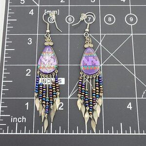 VTG Purple Southwestern Dangle Drop Earrings Beaded Fringe Tribal Pattern Design