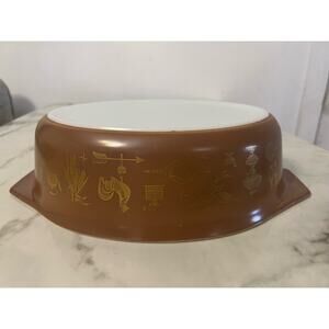 Vintage Pyrex Early American Oval Casserole 2.5QT w/Cover 945-7 Brown & Gold Corning, made in the USA: 1962 thru 1971. Early American was the first pattern printed in 22-karat gold by Pyrex (Corning Ware).