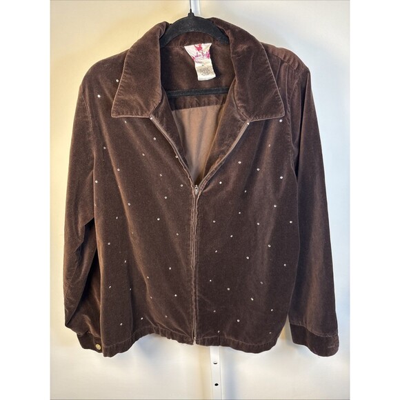 VTG Quacker Factory Women’s Velour Jacket Brown Rhinestones Holidays XL Full Zip
