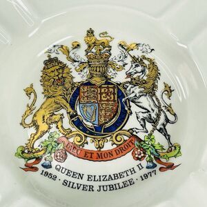 Commemorate a historic royal event with this lovely vintage Queen Elizabeth II Silver Jubilee ashtray! Made by Weatherby Hanley Falcon Ware, this collectible piece celebrates 25 years of Queen Elizabeth II's reign, making it a perfect item for royal enthusiasts and collectors.