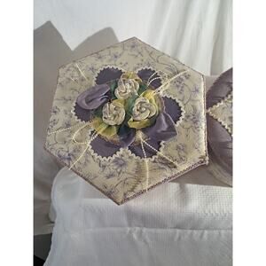 VTG Quilted Gift Box Set Sewing Trinket Box Quilted Floral Cream and Purple