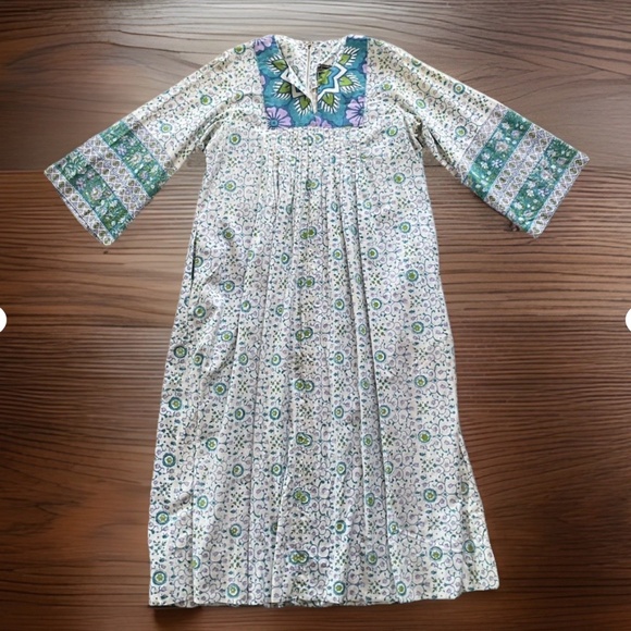 VTG RAMONA RULL Women's M White Blue Floral Cotton Kaftan Duster Dress w Pockets