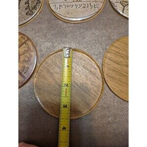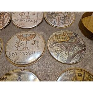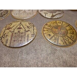 This vintage 1959 set of 11 vinyl drink coasters is a rare souvenir from Israel. Each coaster measures 3 1/2 inches and features unique designs that represent Israel. These collectibles are a unique and nostalgic piece of memorabilia from the Middle East.