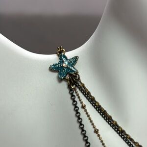 Stunning Betsey Johnson Gold/Black Tone Metal 4 Strand Necklace Featuring a adorable white enamel face fish with blue cabochon eyes, a blue faceted round body and a moveable blue enamel tail, two blue textured starfish with crystals in the centers, a blue enamel crab with 3 small round blue crystals inside of a heart on his belly and red crystal eyes, a clear faceted crystal heart surrounded with blue crystals.