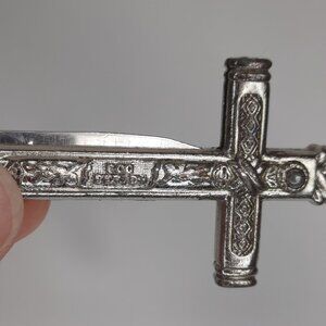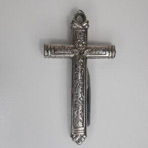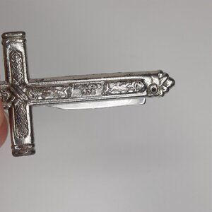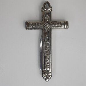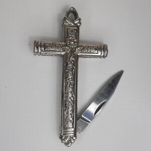 VTG RARE Crucifix Holy Cross Pocket Knife Floral Rose Silver Tone "God Bestow"