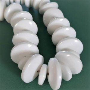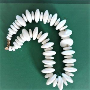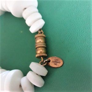 Beautiful Rare Vintage Art Deco white Lucite Saucer shaped beaded Les Bernard Necklace. With a Gold tone barrel clasp and a hangtag that says Les Bernard Inc. Necklace measures 17 inches long. In good vintage condition with a very small amount of wear on hangtag.