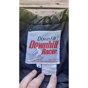 The VTG RETRO Downhill Racer Downfill Snow/ski jacket in size Medium is a vintage ski jacket with a retro design from the 1990s. Made of polyester with a solid black color and red/blue accents, it features a zip closure and is insulated with down for warmth. The jacket is part of the limited edition Downhill Racer brand, perfect for skiing in winter, and includes functional pockets and a full zip design for added convenience. With its retro style and performance features, this jacket is a stylish and practical choice for cold weather activities.
