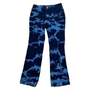 Super Cool, vintage tie-dye corduroy jeans in vibrant hues of indigo and light blue with flare bottoms. Mid to high-rise, 100% cotton, fine wale corduroy with label on front/rear pockets and zipper pull. Five pockets, button/zip front closure. Size 13/14; waist 32, inseam 32." Pre-owned in great condition.