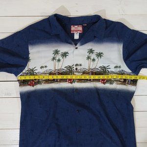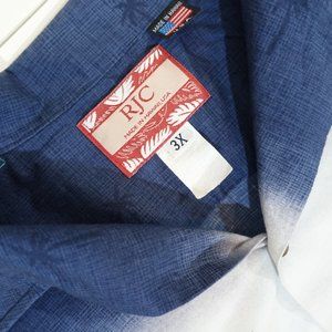 Men's Vintage RJC Hawaiian Blue Button Up Camp Shirt. Shirt has palm trees printed. Shirt is in very good pre-owned condition, however the material tag is faded. Size tag 3X.