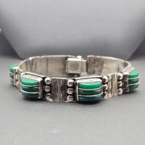 VTG RRA Mexican Sterling Silver Green Onyx Panel Link Bracelet 7" Rope Detail 40