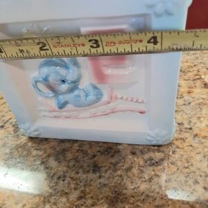 Charming vtg Rubens Originals white and pastel colored ceramic planter featuring playful images of baby animals Subtle pink and blue accents add a playful touch. See photos for approximate measurements