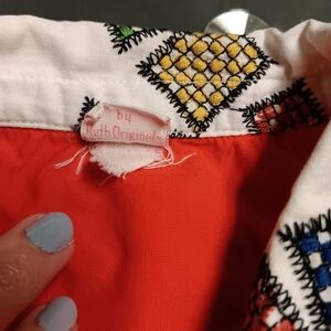 Up for sale is a super cute 1960 Child's shirt made by Ruth of Carolina. The red really pops with the white patch work design on the cuffs and collar. The patches are embroidered in different colors on the white fabric. The buttons have red fabric covering them. The hem is fraying, but I think this may have been made that way but I'm not certain. The size on the tag has faded, but I believe it is a medium from measurements. I will be listing 2 other items similar to this that I purchased at the same time. The colors, cuts, and designs were just too cute for me to pass up and they really do date themselves to the 60s by their styles. Thanks for looking!