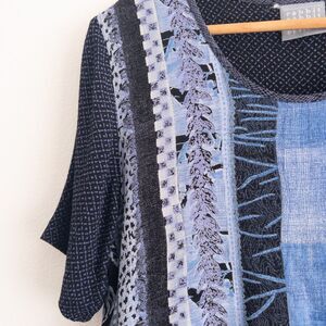 Vintage Rabbit Rabbit Rabbit Design Blue Layered Maxi Dress. A unique dress featuring a geometric pattern in blue, short sleeves, a round neckline, and a layered look. Made from rayon and in the United States.