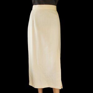 Elevate your office style with this vintage Sag Harbor skirt suit set from Radcliffe. The classic two-piece suit features a winter white color, woven wool material, and a solid pattern that exudes sophistication. The blazer has padded shoulders, a notch lapel style, and a single-breasted cut with one-button front closure. Meanwhile, the skirt has an elastic waistband at the back, a 7" back zipper, and a 16" front slit that adds movement to the maxi low calf ankle-length silhouette. The set also includes practical details such as slash pockets and lining made of 100% polyester. The Blazer is Petite Size 12 and the Pencil Skirt is Size 16. Ideal for business occasions during winter, this suit will surely complement your career-focused wardrobe without mentioning its excellent condition. Good Preowned Vintage Condition. Has Moth Hole on Back of Skirt (See last photo). Approximate Measurements are on 2 Photos. Black Shirt not Included, For Display Only