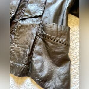 Features: This beautiful blazer style open front leather jacket semi padded shoulders, unique dolman sleeves and deep exterior pockets.