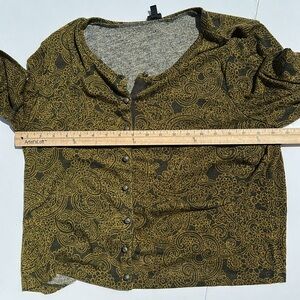 The VTG Rafaella Button Down Cardigan Sweater in Women's Size X-Large is a stylish and versatile addition to any wardrobe. Featuring a geometric black and gold pattern, long sleeves, and a button accent, this vintage piece is perfect for layering during the winter, fall, and spring seasons. The lightweight and stretchy sweater is designed for a comfortable and classic fit, making it a perfect choice for various occasions, from casual to dressed up. The designer brand, retro theme, and paisley-inspired accents give this cardigan a unique and eye-catching appeal.