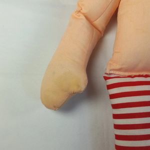 ** Hair is a little dirty, small spots/stains on body and a few small spots on clothing from storage as shown in photos. Most should be able to clean up some. Hat is only attached on one side. Overall good condition for age.