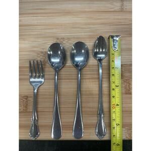 4 children's serving utensils (3 spoons and 1 fork - all stainless steel)