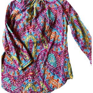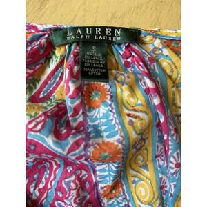 This is a Lauren Ralph Lauren blouse for women in size S. The blouse features a paisley pattern, 3/4 sleeves, and a V-neckline. It has a pullover closure and is made of 100% cotton woven fabric. The blouse is accentuated with a ruffle and has a relaxed fit. It is lightweight and breathable, making it perfect for summer and spring occasions such as parties, cocktails, or business meetings. The blouse has a casual sleeve and a tunic style. It is machine washable and has a vintage look. The blouse is colorful, peasant, bohemian, and 80s themed. It is made in Sri Lanka.