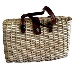 VTG Rattan Basket Square Handbag 80s Sturdy Eco Friendly Leather Strap Cream