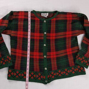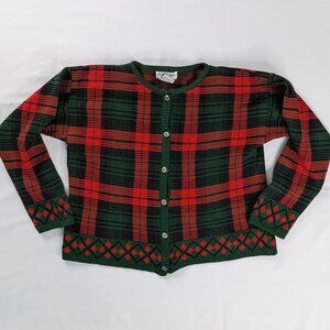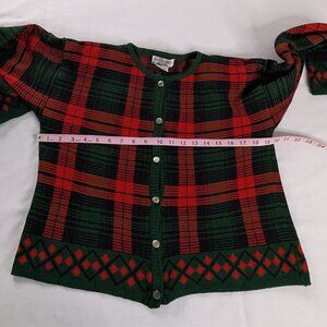 VTG Red Green Tartan Plaid Argyle Metal Button Up Knit Cardigan Academia Revival