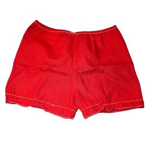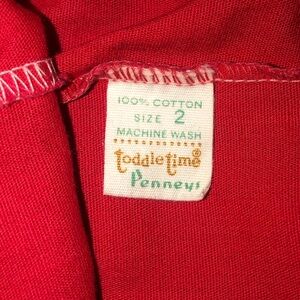 Adorable vintage 1960s baby outfit by Toodle Time (J.C. Penney’s). This sweet set includes solid red cotton shorts and a matching red top with red and white striped trim. A charming piece of mid-century children’s fashion!