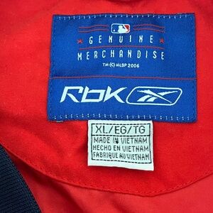 The Reebok MLB Men's XL Pullover Hot Windbreaker Jacket in red is an officially licensed garment for fans of the Anaheim Angels baseball team. Made in Vietnam, this jacket is perfect for showing support during regular season games. The bold design and comfortable fit make it a must-have for any male MLB fan looking to represent their favorite team in style.