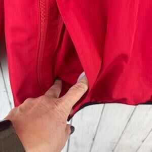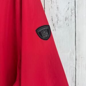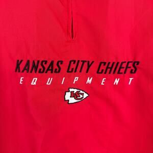 Details: 100% polyester, red with embroidered "Kansas City Chiefs Equipment" and logo on the center front, 1/4 zip closure with a stand collar, front pockets, thin banded cuffs and waist, vented back, machine wash.