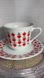 ☕️Charming mid-century Relpo Japan porcelain teacup and saucer set featuring a whimsical red hearts and black fleur-de-lis pattern. The glossy white background highlights the bold design beautifully, making it a perfect addition to any vintage kitchen, Valentine’s display, or retro collection.