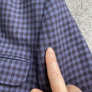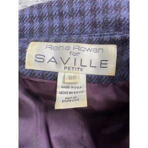 This is a vintage blue houndstooth blazer jacket by Rena Rowan for Saville made in USA. It is made of worsted wool tweed with a rayon lining and features a button accent. The jacket is a size 16 regular and has a classic style. It is designed for women and has a size type of regular. The blazer is pre-owned and has a size of 8P.