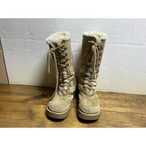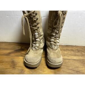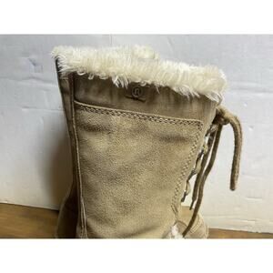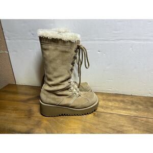 The VTG Report Camel Suede Boots in size 6.5 feature a round toe shape, lace-up closure, high wedge heel with a 2-inch platform, and mid-calf shaft style. They are accented with fur trim, lace, zipper, and logo detailing, making them perfect for various occasions like travel, activewear, party, casual outings, and workwear. Made of blended fabric with a rubber outsole, these vintage-style boots have a bubble gum sole, lined interior, and adjustable features. The solid tan color and retro theme of these boots make them a standout and trendy choice for the winter and fall seasons.pre owned have a few spots shown in pictures we ship fast