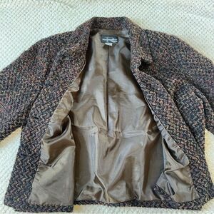 Lightweight soft mocha brown multicolor tweed blazer jacket by Requirements. Features a blend of rich colors. Ideal for stylish layering.