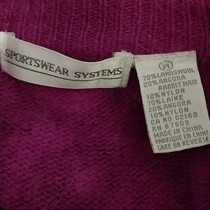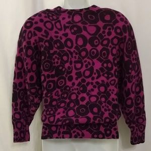 Unique Vintage Find! Hot purple & black retro abstract print sweater. Ribbed crew neckline w/3" ribbed sleeve cuff & 5" ribbed bottom. Soft & cozy angora blend...see tag for material content. Removable velcro shoulder pads. NOTE: Velcro just on the shoulder pads themselves & not on sweater. Like New Vintage...no flaws! Bust 19" across, 24.5" Long shoulder to hem. Sleeves 12" wide shoulder to armpit & 17" long. Measurements are exact.