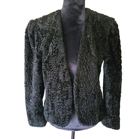 VTG Retro Jacket Womens 14 Black Faux Fur Crop Curly Lamb Coat Mobwife Downtown
