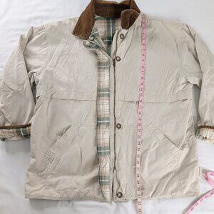 Reversible, green cream plaid side, cream khaki other side, both have zipper and button up