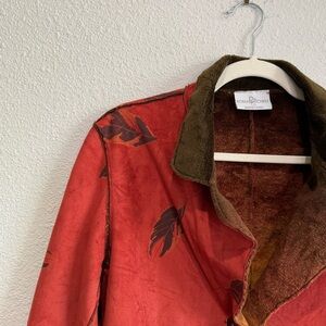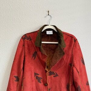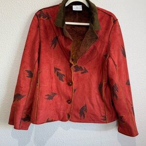 VTG Reversible Jacket Red Faux Suede + Fur Casual Button Up Boho Artsy Leaf L