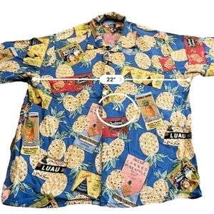 The VTG Reyn Spooner Joe Kealuhas All Over Graphic Print Pineapple Camp shirt is a vintage men's button-down featuring a unique graphic print with a Hawaiian theme. Made from bamboo rayon fabric, this multicolor shirt has a collared neckline, short sleeves, and a spread collar style. Perfect for casual occasions or travel, this limited edition shirt is adorned with embroidered accents and comes in a classic Medium size. With a nod to 80s and 90s fashion, this designer piece exudes a tropical vibe that is sure to make a statement.