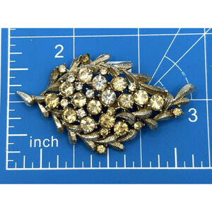 J1-3018 This vintage brooch features clear round rhinestones in a leaf shape design, measuring 2.5 inches in length. The main stones are yellowing (still stunning), but were white/colorless glass set in a prong setting. It i s a fashion accessory that showcases a yellowing intensity in the rhinestones, making it a unique and timeless piece of jewelry.