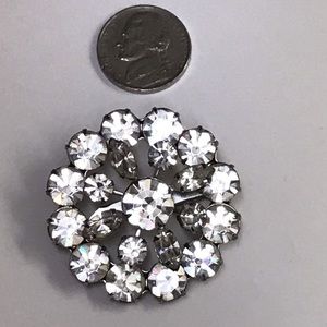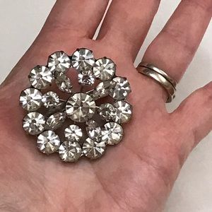 Really pretty and large clear rhinestone and silver tone pin. In great shape with all stones. Slightly tarnished in the back on one part but doesn’t affect the front.