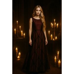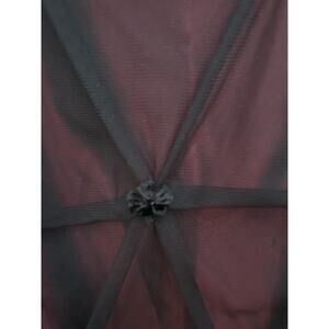 • Color: Deep wine red underlay with sheer black mesh overlay, creating a striking contrast